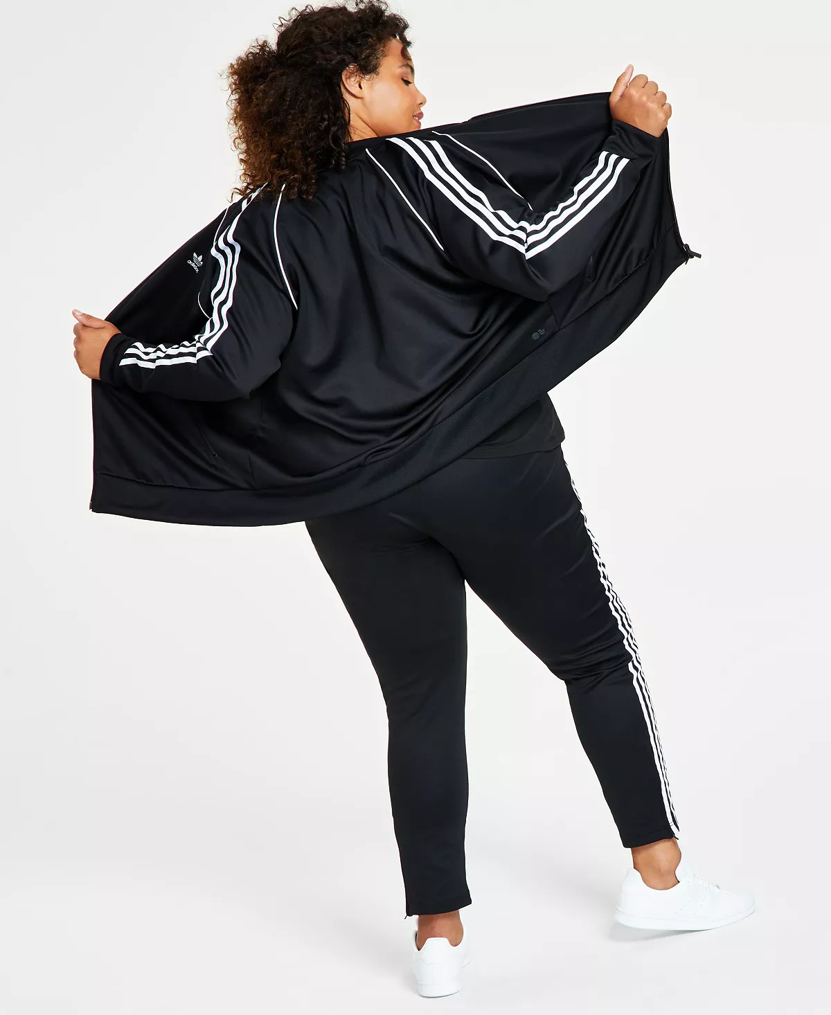 A classic look that’s full of sporty attitude, adidas’ plus size track jacket, T-shirt and track pants can be worn together or mixed with other athleisure pieces.