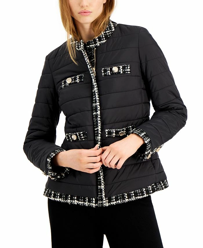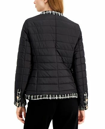 Anne Klein creates a chic workday look with this quilted jacket, lavished with tweed trim and gold buttons.