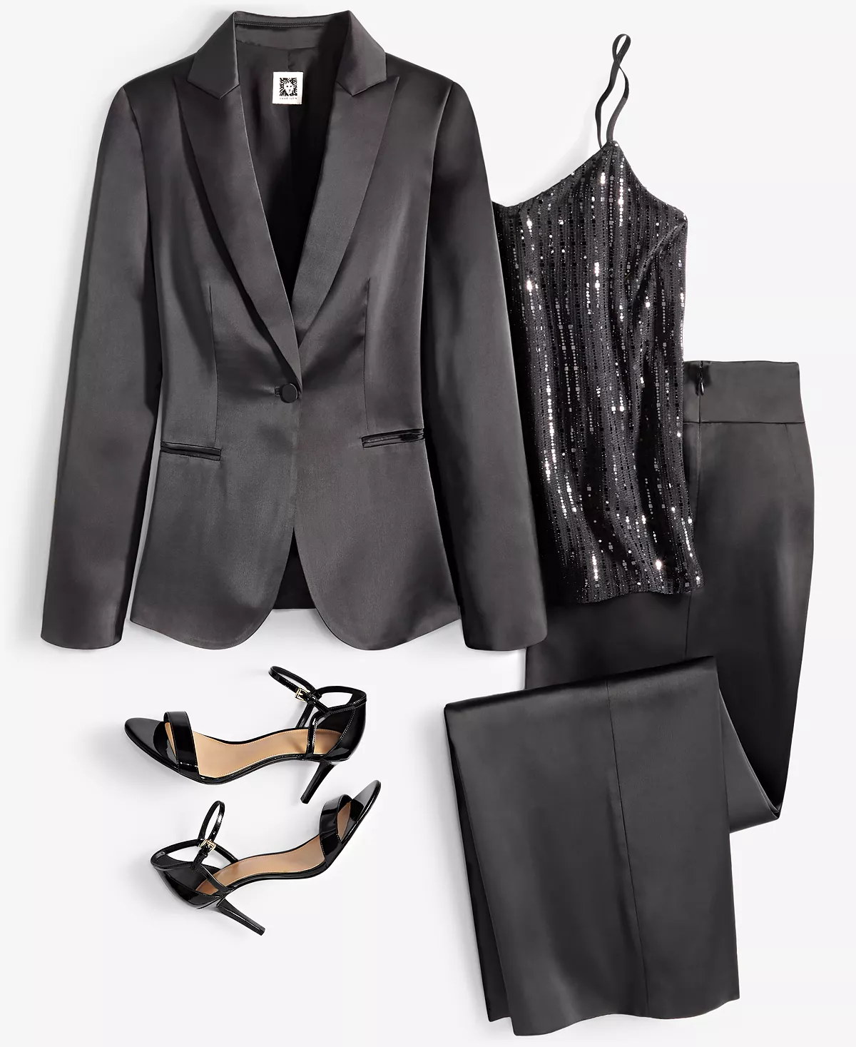 So chic: this mix of a one-button jacket, shimmering cami and wide-leg pants from Anne Klein is perfectly stylish for elegant events.