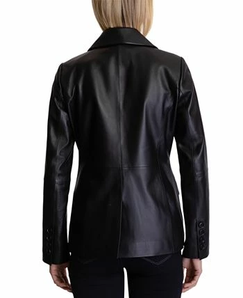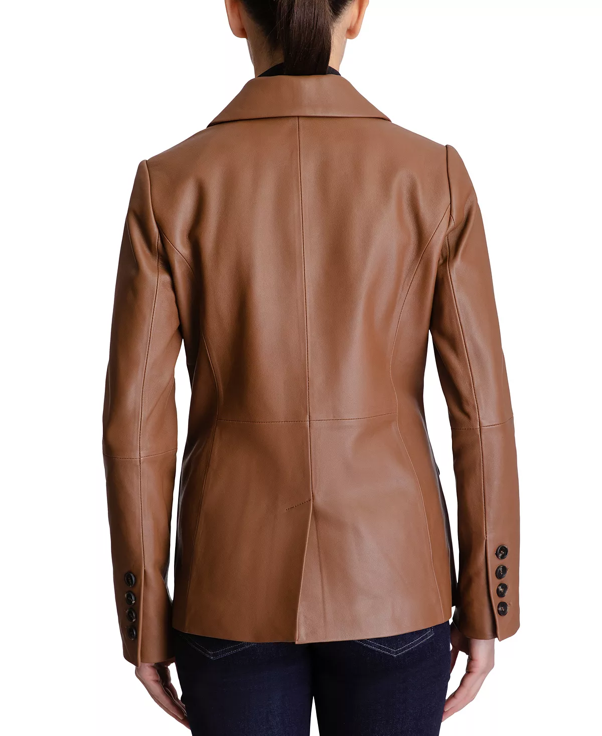 Classic with a fashionable twist, this blazer-inspired coat from Anne Klein is designed in glossy leather.