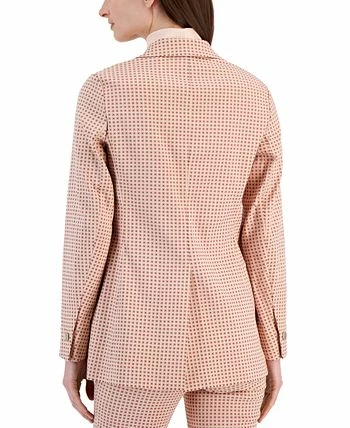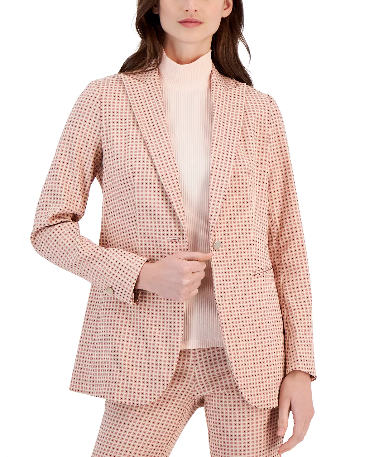 A stylish square foulard print adds a menswear-inspired touch to Anne Klein’s stretch-enhanced, single-button blazer.