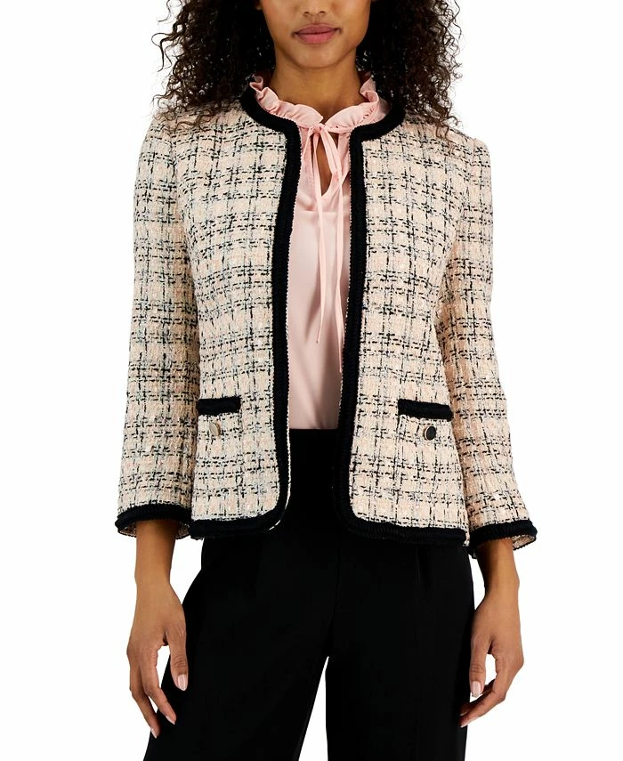 Top off your work look in timeless style with this tweed braided-detail blazer from Anne Klein.