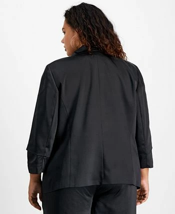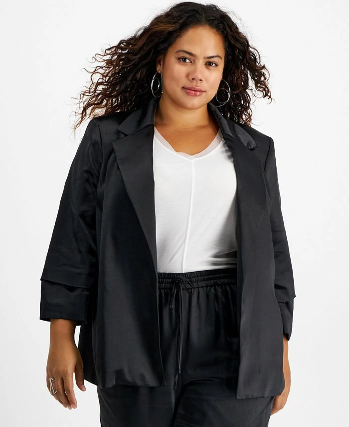 Pleats in the sleeves modernize the classic notched-collar shape of this Bar III plus size open-front jacket. Washed satin brings fresh texture to your workplace.