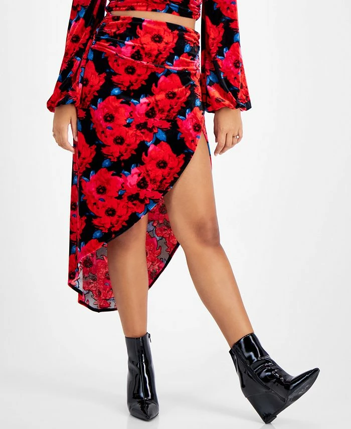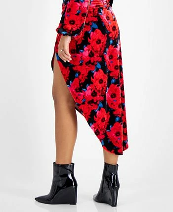 Bold prints and an extended slit at front are the stars of this midi velvet skirt from Bar III.