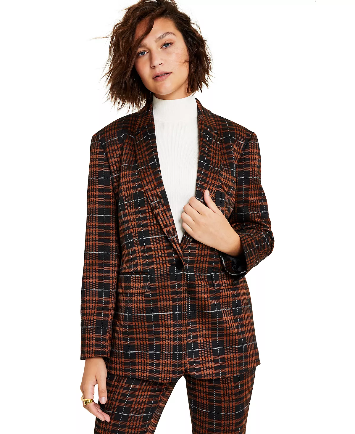 Bar III brings a timeless blazer back with this plaid style. A notch-collar and shoulder pads reinvent the silhouette.