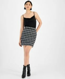 A modern pencil silhouette stylishly suits the timeless plaid tweed of Bar III’s mini skirt to update a workday wardrobe.