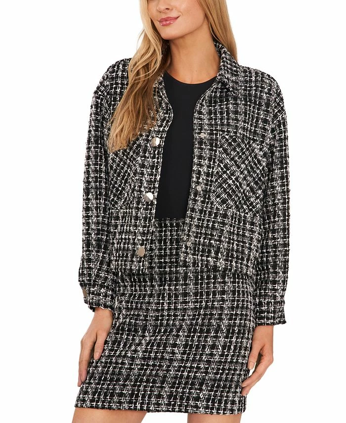 Professionally oriented with a tweed finish and flattering silhouette, CeCe’s pocket-front shacket gives your office wardrobe a modern spin.