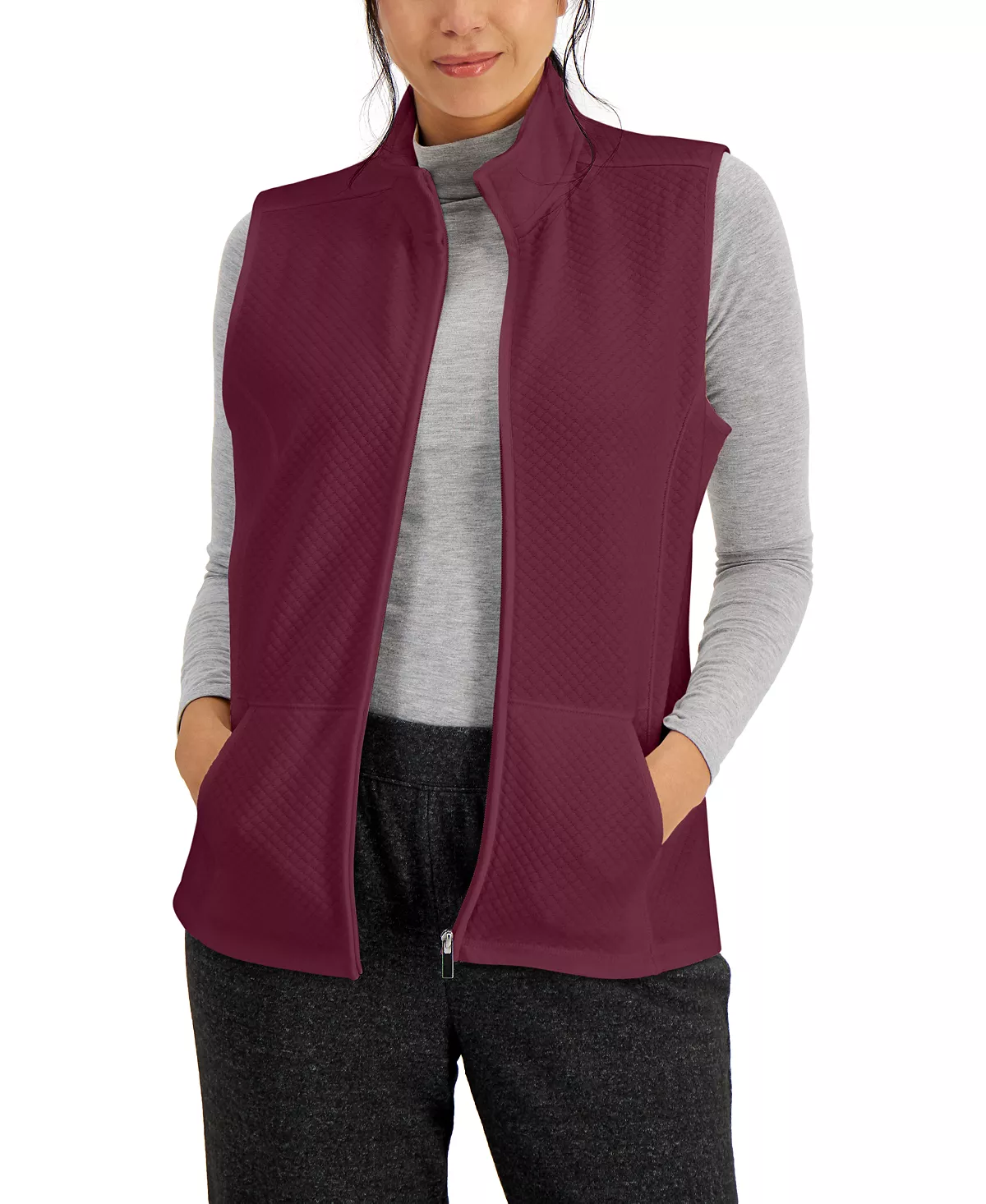 Change up your look with this Karen Scott vest, a relaxed fleece piece with stylish quilting and limitless versatility.