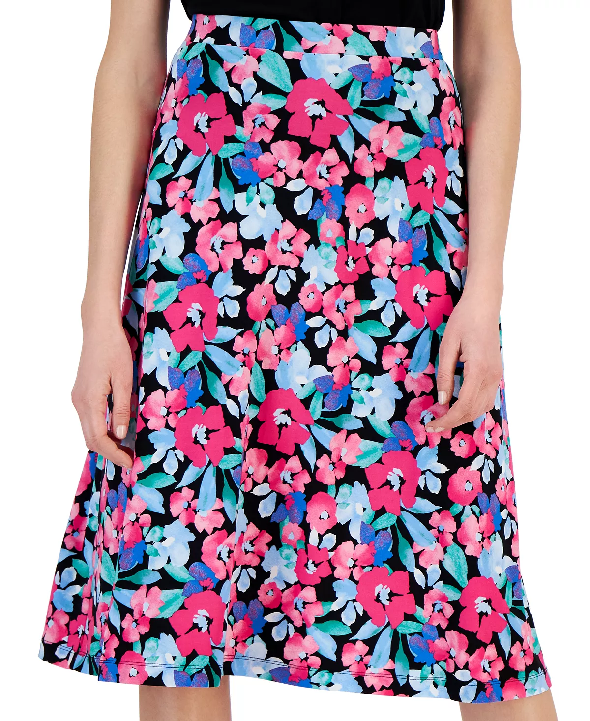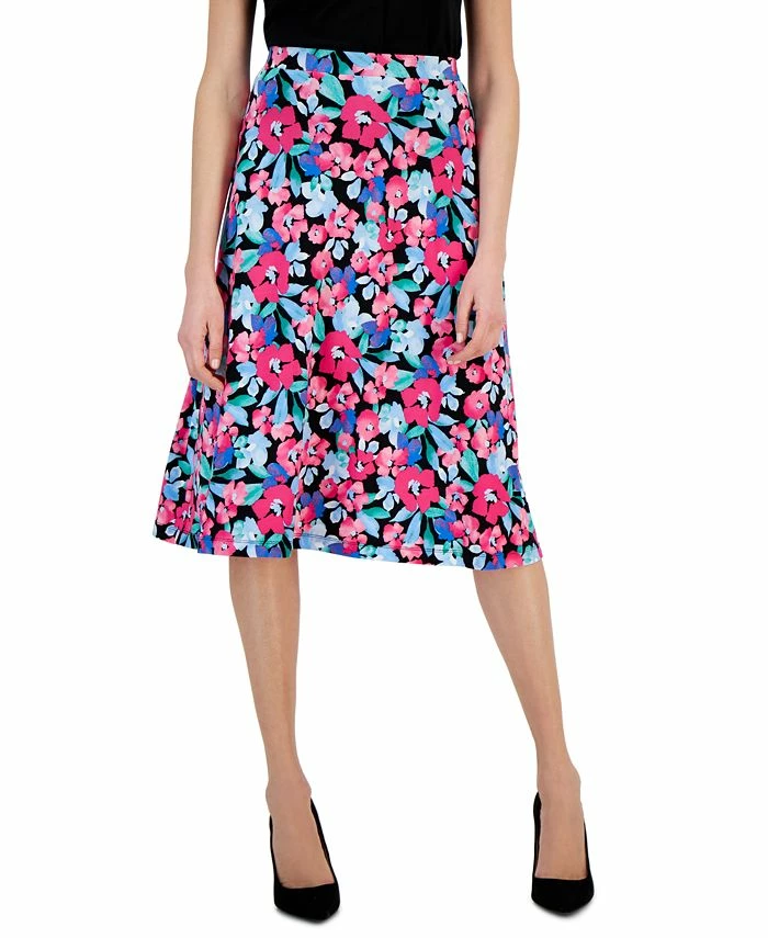 Vibrant floral print effortlessly works into your wardrobe with this pull-on midi A-line skirt from Kasper that you can dress up or down to meet your fashionable needs.
