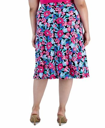 Brighten your work look in this plus size pull-on midi skirt from Kasper, covered in a bright floral print.
