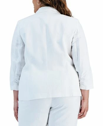 Top off your work look in timeless style in this plus size one-button ruched-sleeve blazer from Kasper.