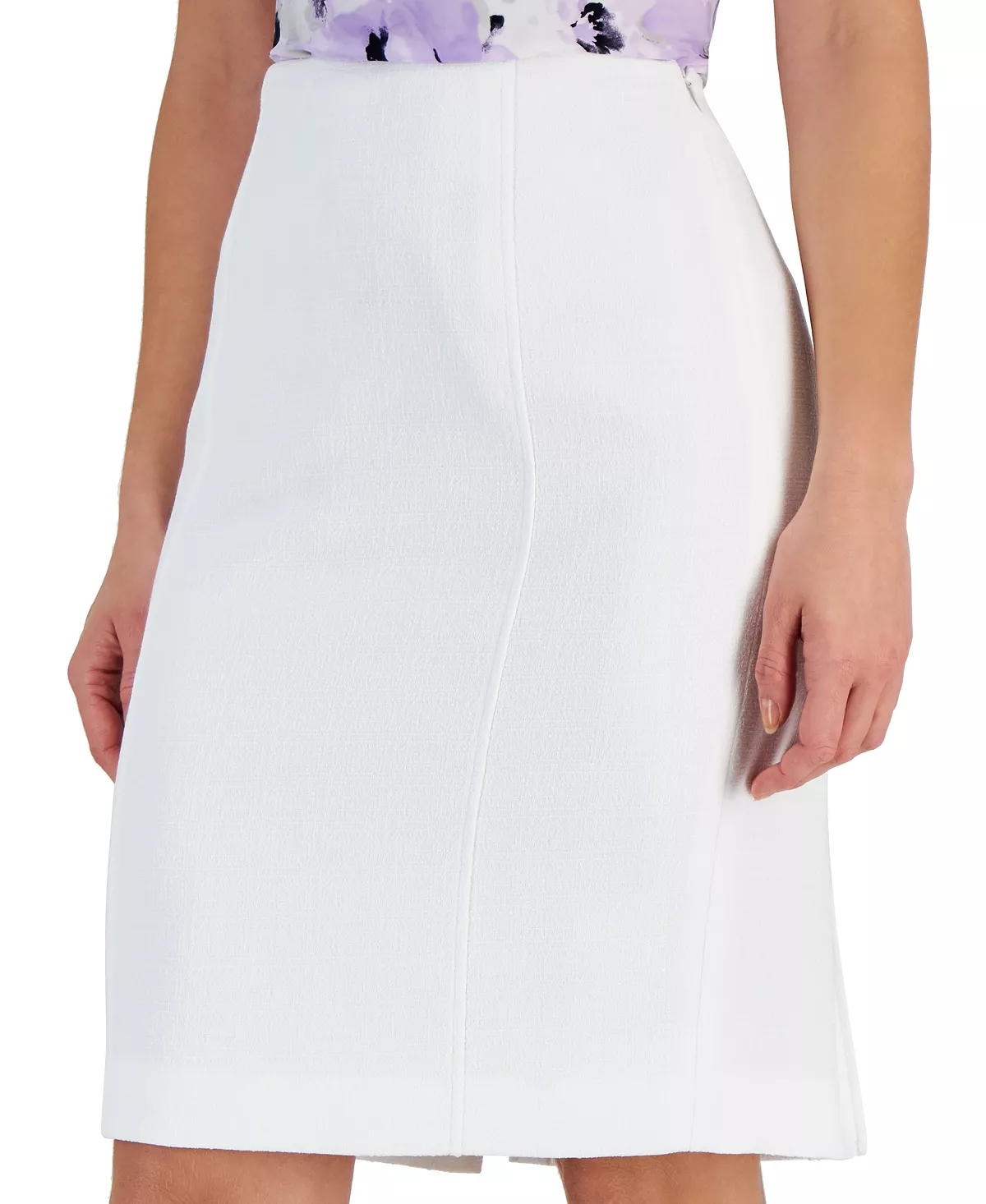 A subtle tone-on-tone jacquard fabric enhances the clean-lined design of Kasper’s pencil skirt.