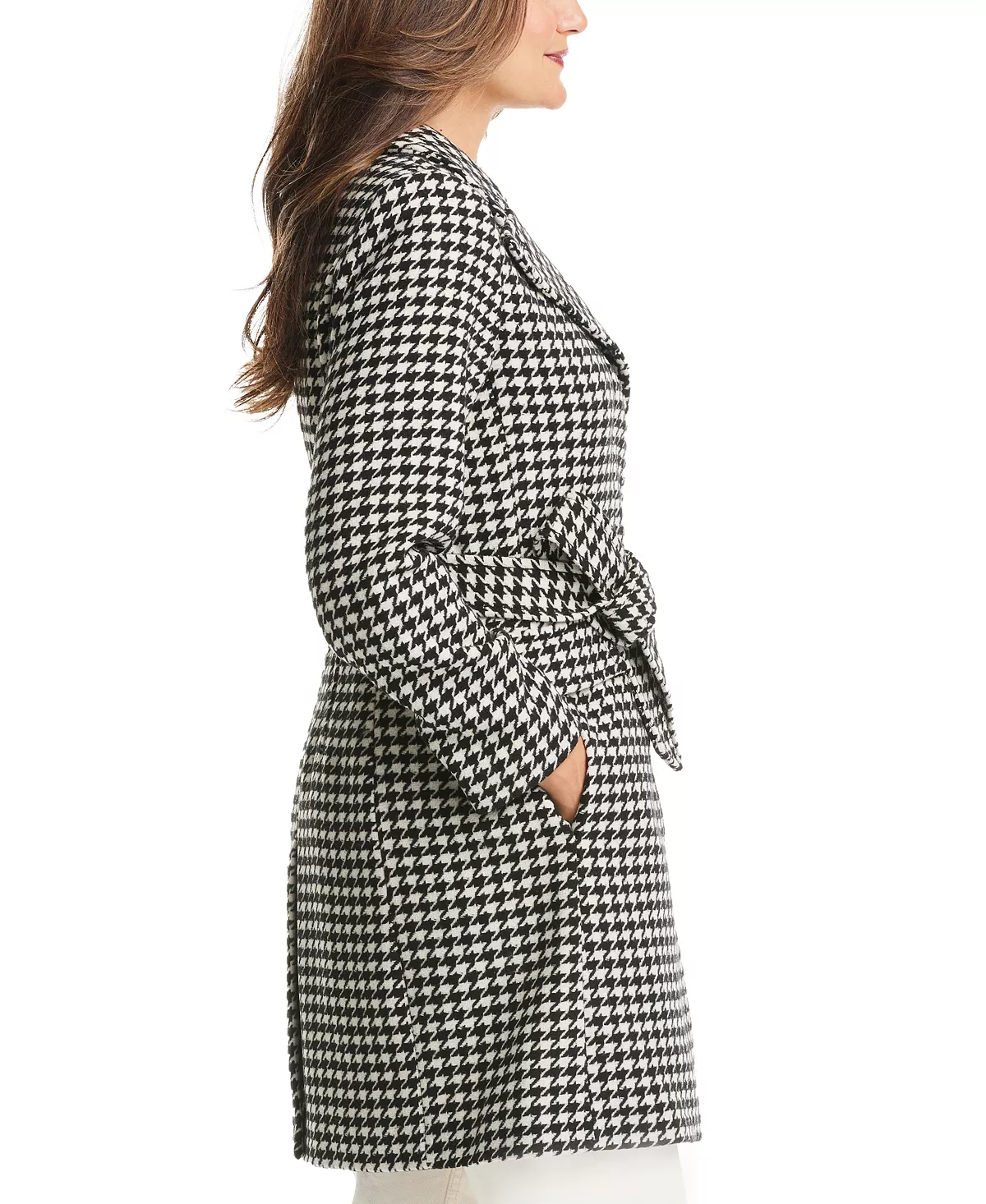 A timeless houndstooth print covers every inch of this belted wrap coat from Kate Spade New York.