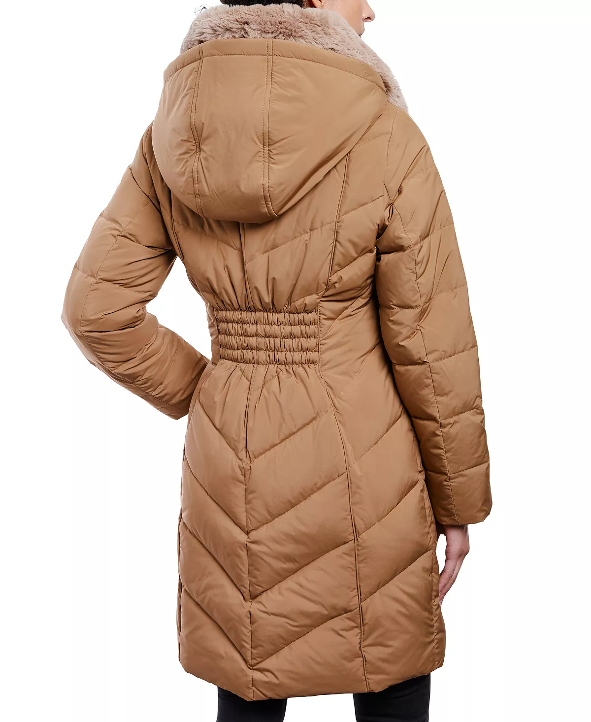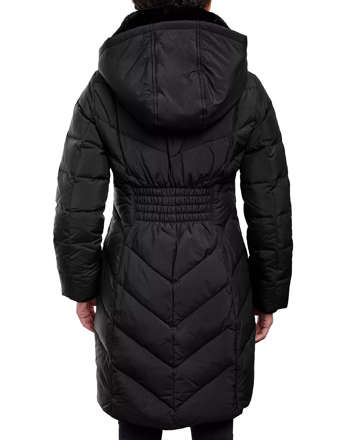 - Stand collar with removable faux fur & zip-off hood; front zipper closure