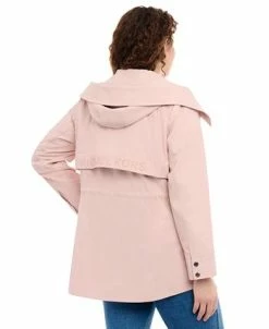 - Stand collar with attached drawstring hood; front zipper closure with button overlay