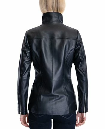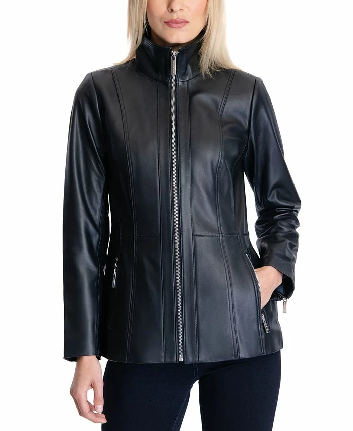 A sleek funnel collar tops off this stunning leather coat from MICHAEL Michael Kors, designed with two zip pockets and a full zip front.