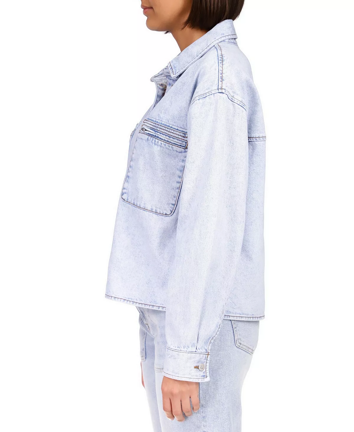 Zipper pockets at the chest add a contemporary feel to this button-down denim jacket from Sanctuary.
