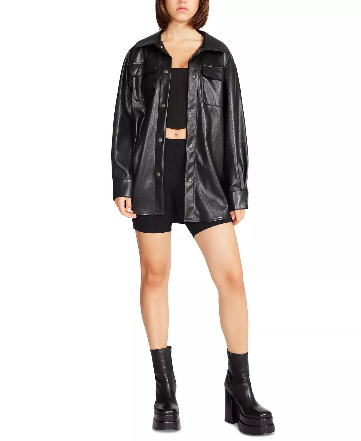 The perfect hybrid. BB Dakota’s Faux Good Measure Shacket is a sophisticated, faux leather shirt jacket with an oversized fit, button-front and front pockets.