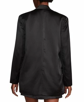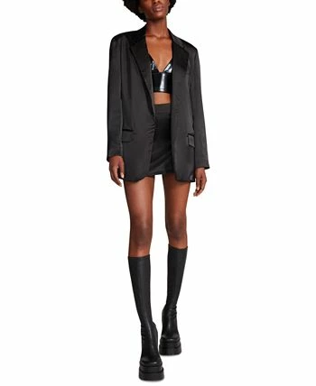 Steve Madden’s lustrous satin blazer is designed with an open front for easy on-the-go styling.